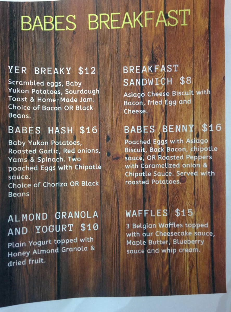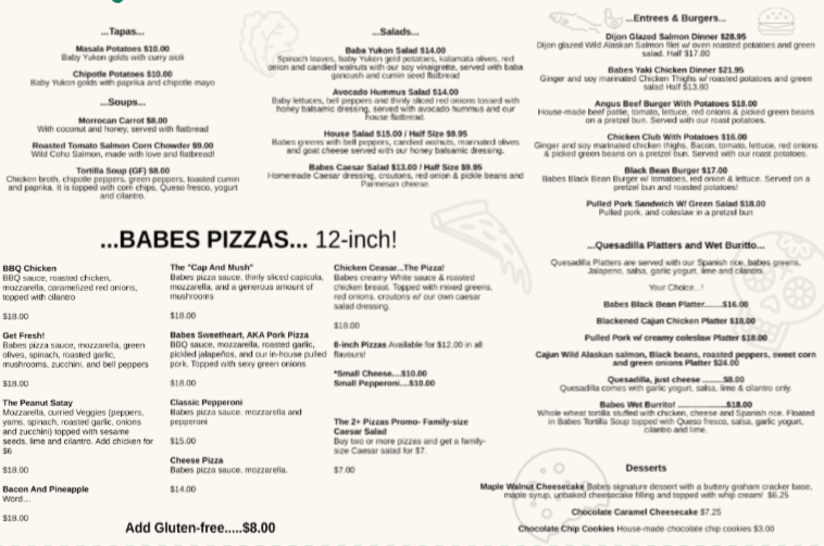 The 12-inch pizza section is clearly a main attraction, offering playful variety through BBQ Chicken, Get Fresh!, The Peanut Satay, Bacon And Pineapple, and The "Cap And Mush"-a spread that covers classic cravings and more adventurous flavor combos. For bigger plates, the menu leans into satisfying staples such as Dijon Glazed Salmon Dinner, Babes Yaki Chicken Dinner, and burgers like the Angus Beef Burger With Potatoes, Chicken Club With Potatoes, and Black Bean Burger-so whether you’re in the mood for seafood, poultry, or a meatless bite, there’s a clear option. The quesadilla and burrito section keeps things customizable and hearty with platters like Babes Black Bean Platter, Blackened Cajun Chicken Platter, Pulled Pork w/ creamy coleslaw Platter, plus the loaded Cajun Wild Alaskan salmon, Black beans, roasted peppers, sweet corn and green onions Platter, alongside a simple Quesadilla, just cheese for purists. And for a sweet finish, desserts like Maple Walnut Cheesecake, Chocolate Caramel Cheesecake, and Chocolate Chip Cookies make the ending feel indulgent but approachable-exactly the kind of menu that suits a relaxed island meal.