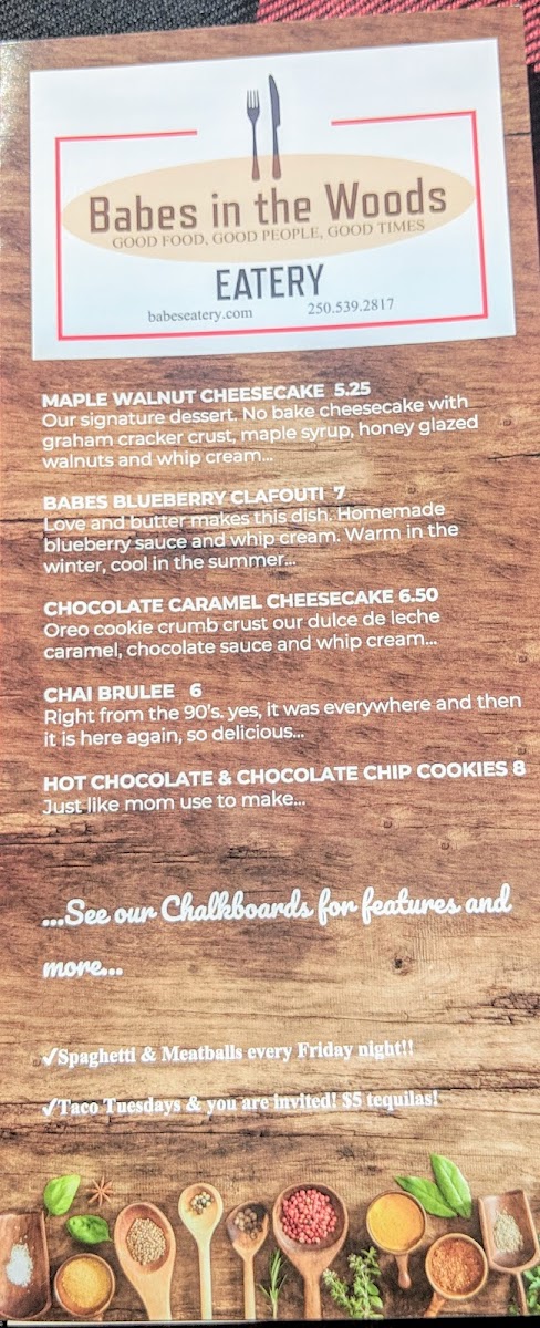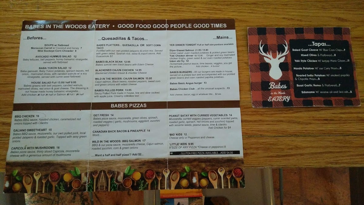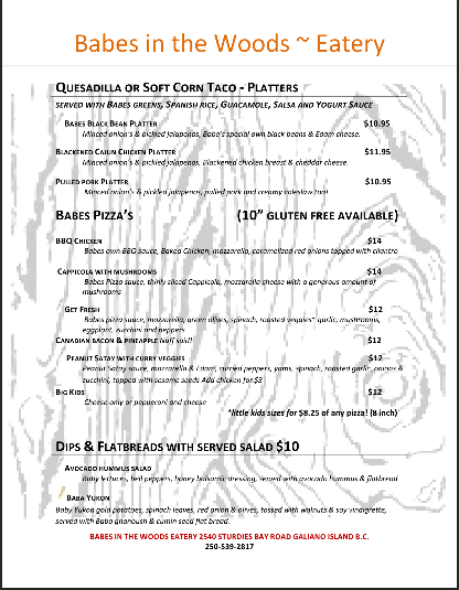 Wrapping up, the menu at Babes In The Woods (60 Madrona Dr, Galiano Island) feels like a fun, comfort-food-driven mix that’s easy to browse and even easier to crave. If you’re snacking or sharing, the tapas options-Masala Potatoes and Chipotle Potatoes-set the tone with bold seasoning and casual, “grab-a-bite” energy. The soup lineup adds a cozy, homemade vibe, ranging from Morrocan Carrot to the heartier Roasted Tomato Salmon Corn Chowder, with the Tortilla Soup (GF) as a nice gluten-friendly pick. Salad choices like Baba Yukon Salad, Avocado Hummus Salad, House Salad, and Babes Caesar Salad balance things out with lighter, fresher options.